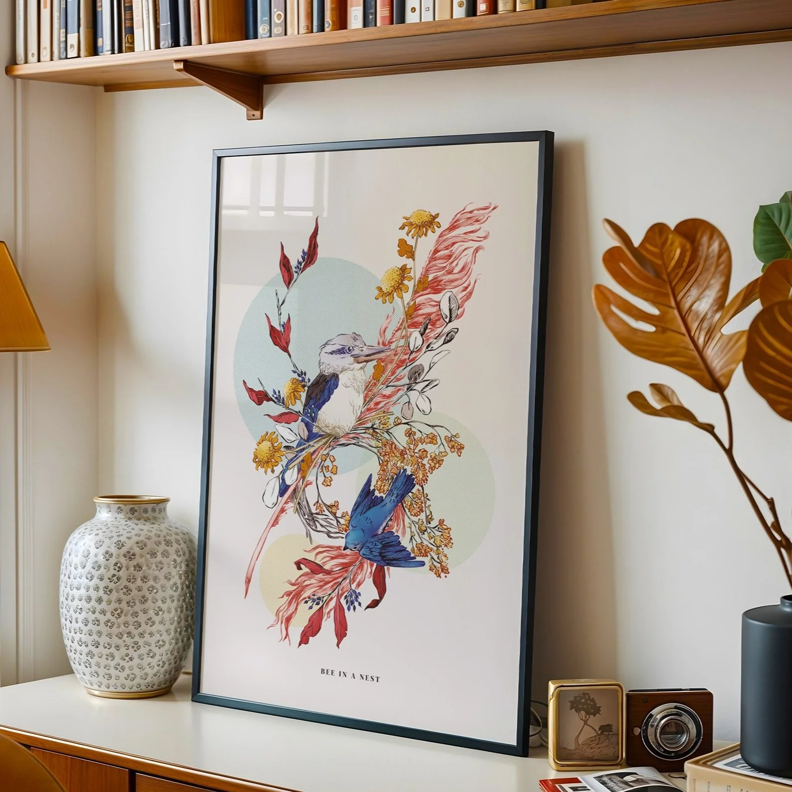 Stampa di composizione floreale con soggetto un Kookaburra e un rondone. Perfetta per decorare soggiorno o corridoio. Ideale come idea regalo per lei.